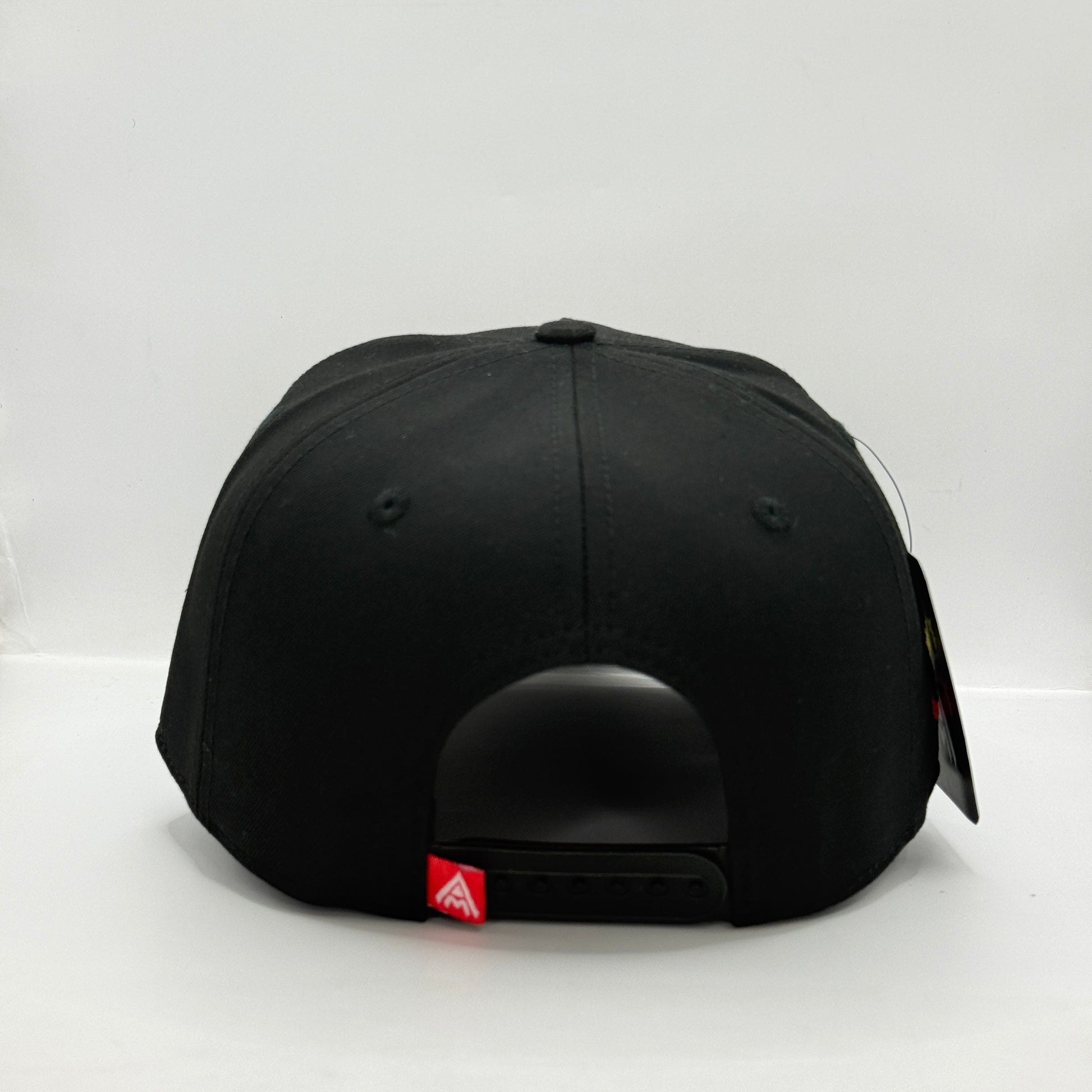 Ajuste Personalizado (Snapback): Cierre trasero ajustable de plástico negro, complementado con la pequeña etiqueta de marca AMBULA (roja y blanca) para un ajuste seguro.