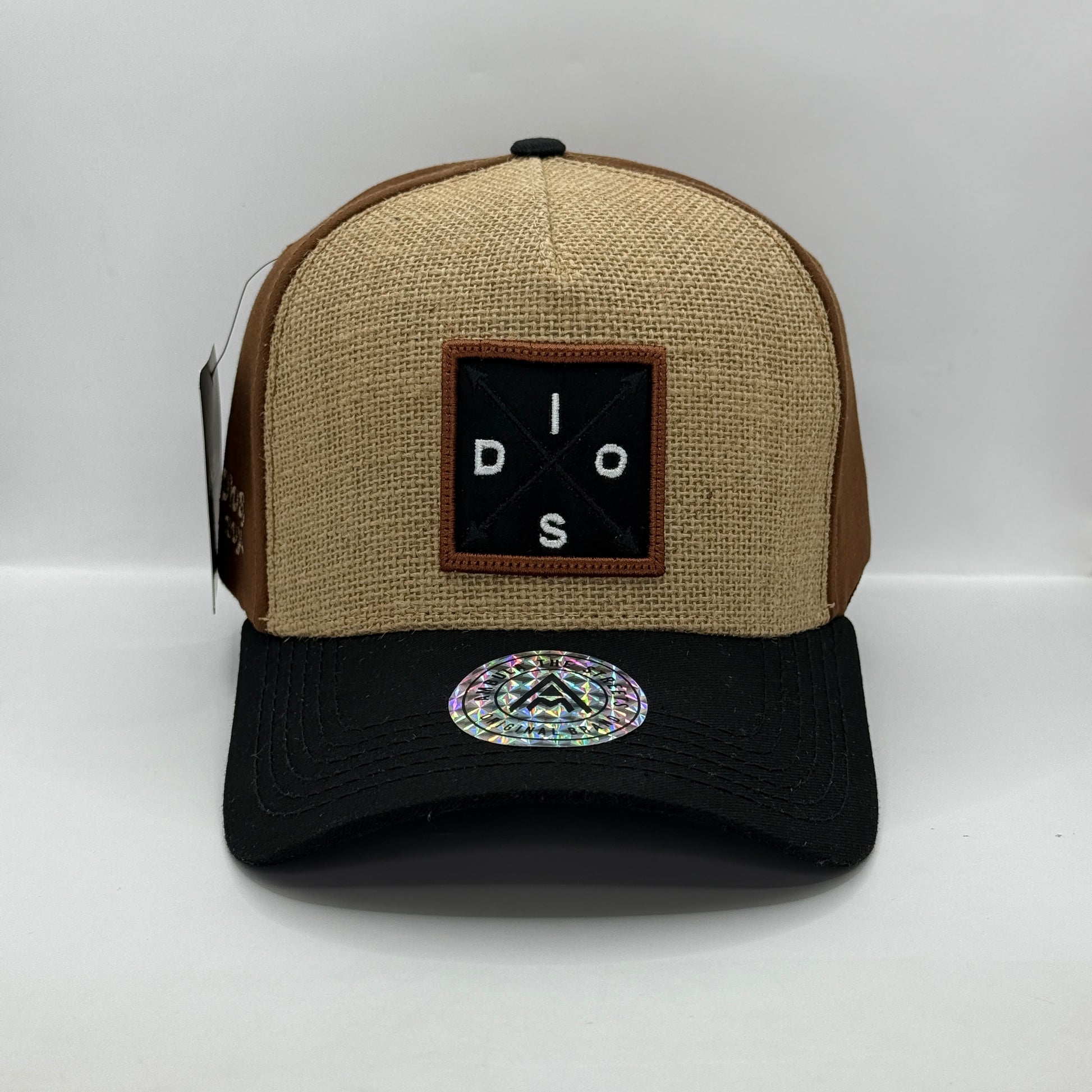 Emblema Central de Fe: El frontal (panel de yute) lleva un parche cuadrado de color Negro con el texto "D I O S" dispuesto en forma de cruz, bordado en blanco o beige claro. El parche tiene un marco de costura en contraste, resaltando el mensaje central.