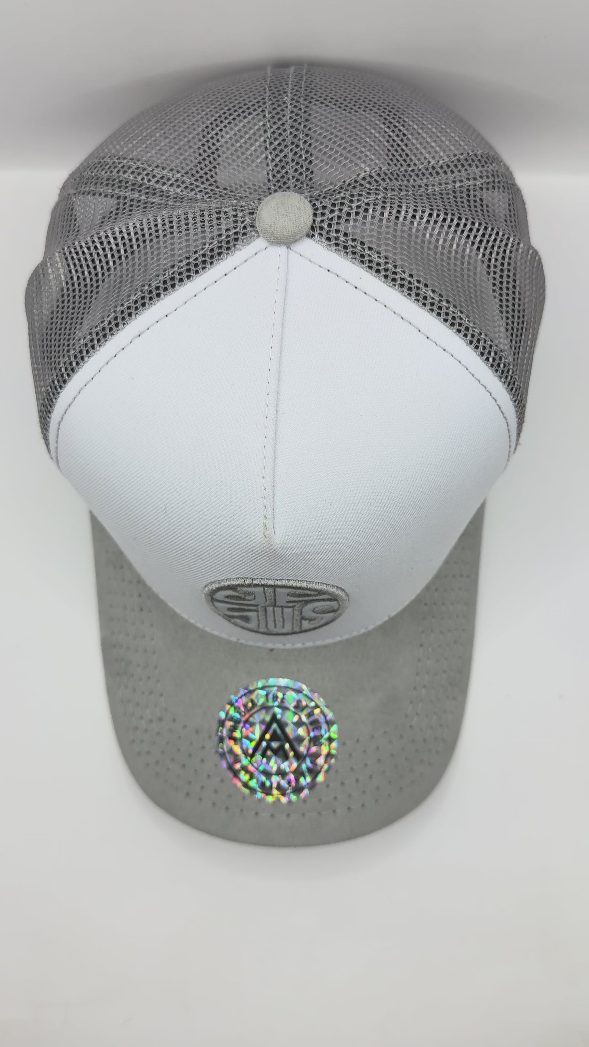 Contraste de Textura y Color: El panel frontal estructurado es de color Blanco Puro, y la visera curva es de un elegante Gris Claro con textura de gamuza (suede). La malla trasera es de color Gris o Blanco Cremoso, a juego con el diseño.