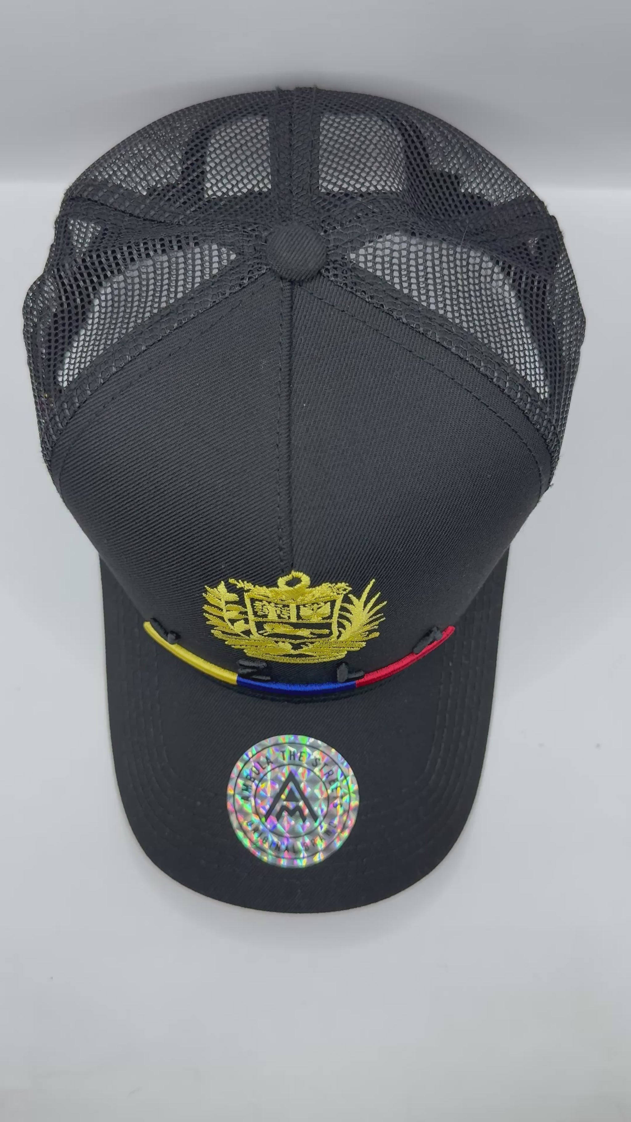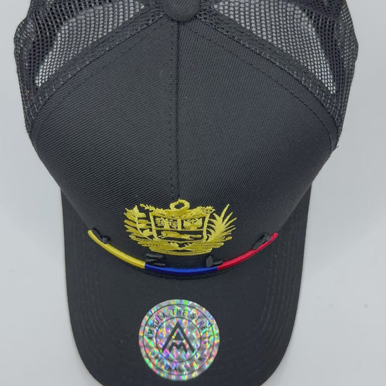 La Gorra Trucker AMBULA Edición "VZLA ESCUDO" es un accesorio diseñado para los que llevan sus raíces con orgullo y estilo. Combina el diseño All Black de AMBULA con un bordado majestuoso y los colores vibrantes de la bandera de Venezuela.