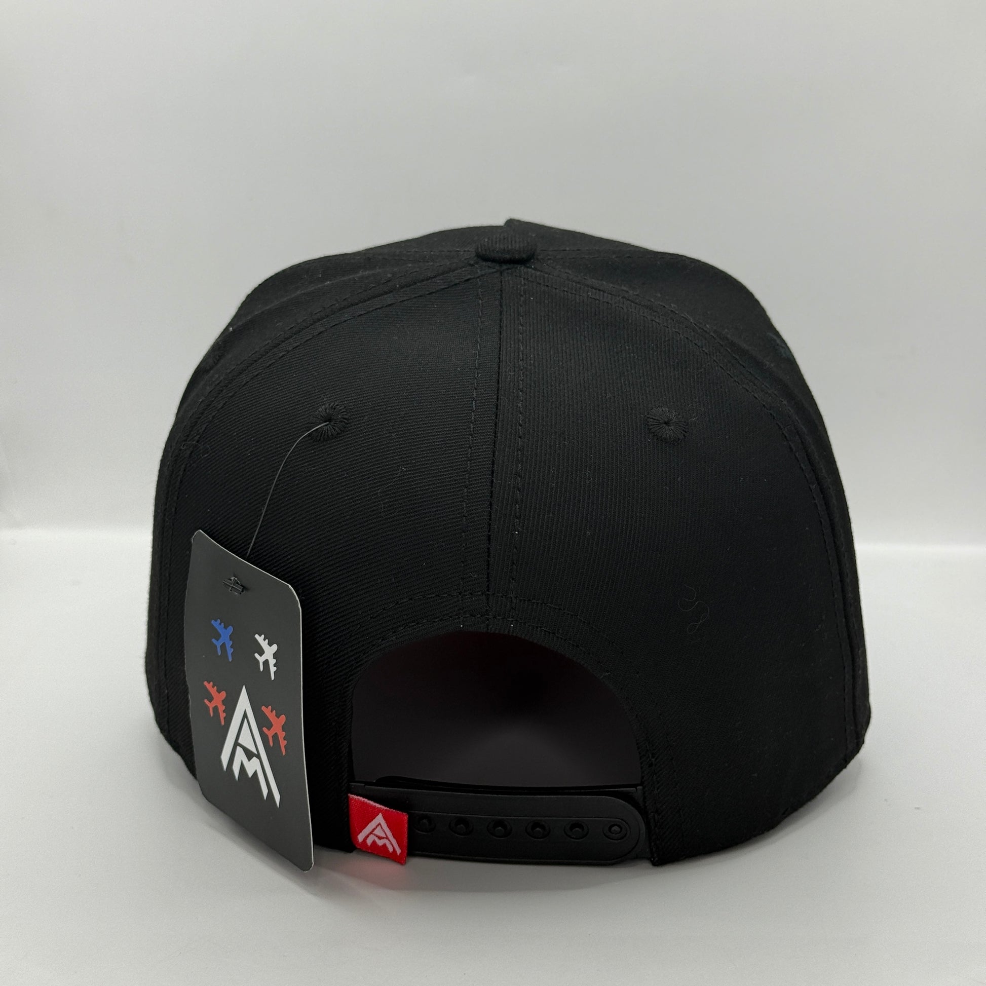 Ajuste Personalizado (Snapback): Cierre trasero ajustable de plástico negro para un calce seguro y adaptable a cualquier tamaño. Incluye una pequeña etiqueta de marca AMBULA (roja y blanca) junto al cierre.