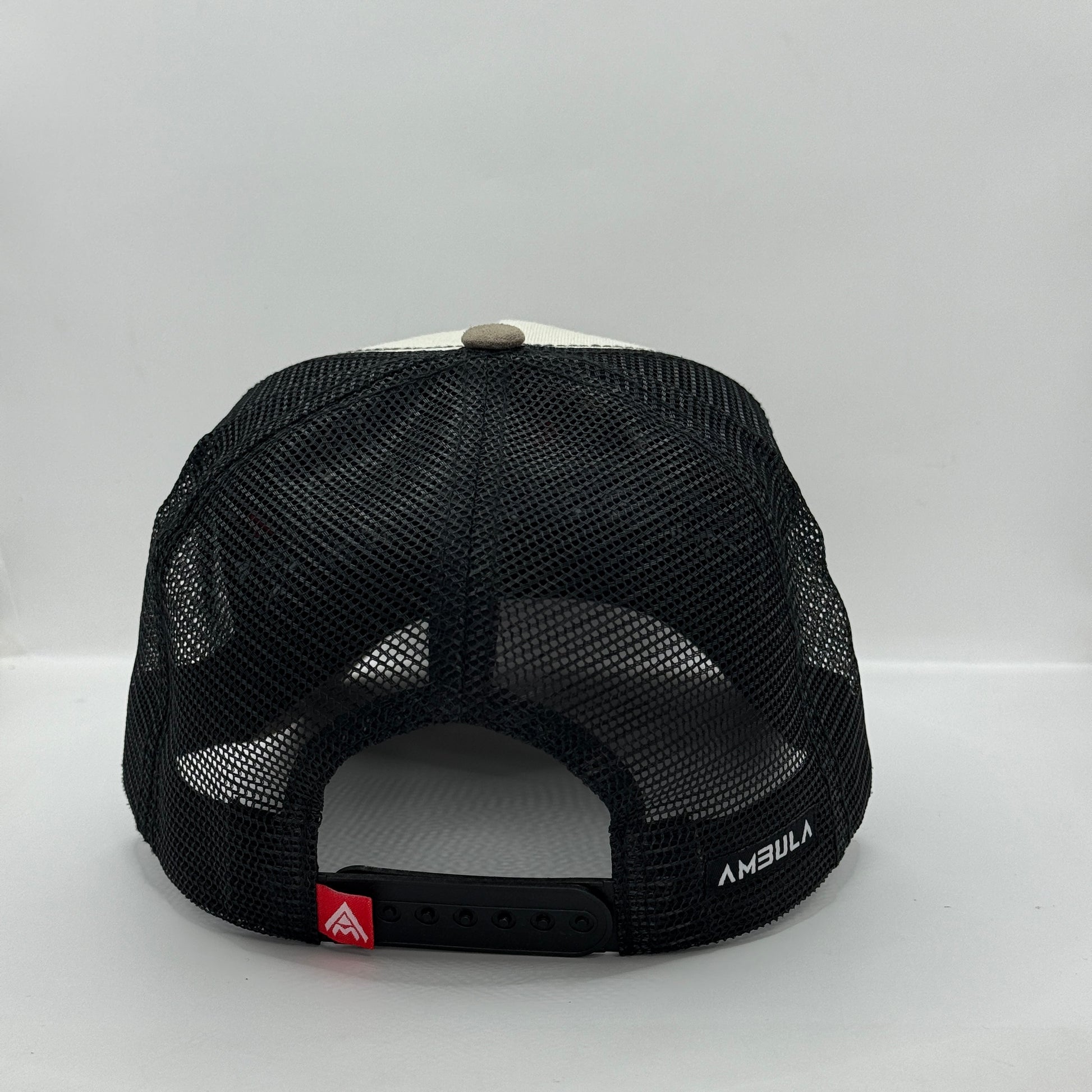 Ajuste Personalizado (Snapback): Cierre trasero ajustable de plástico Negro, complementado con una pequeña etiqueta de marca AMBULA (roja y blanca) que garantiza un calce seguro.