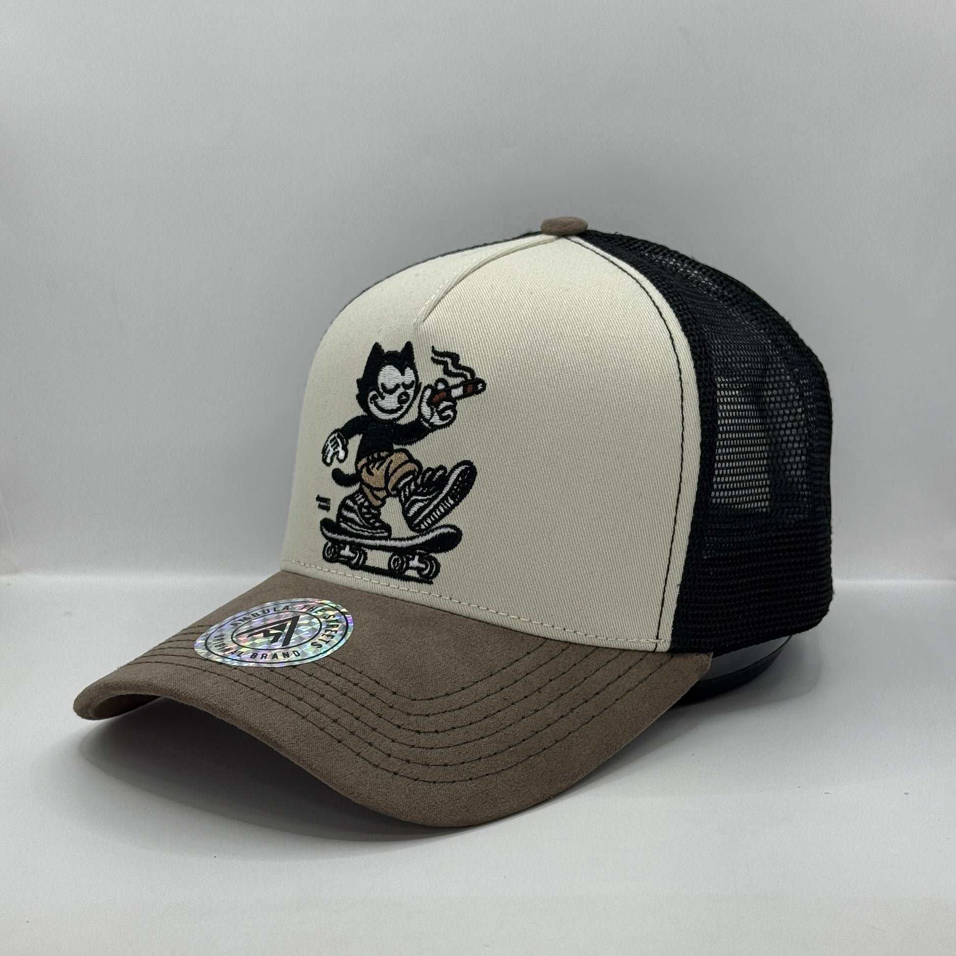 Gorra Trucker AMBULA - Edición "SKATER CAT" (Crema & Gris Suede)