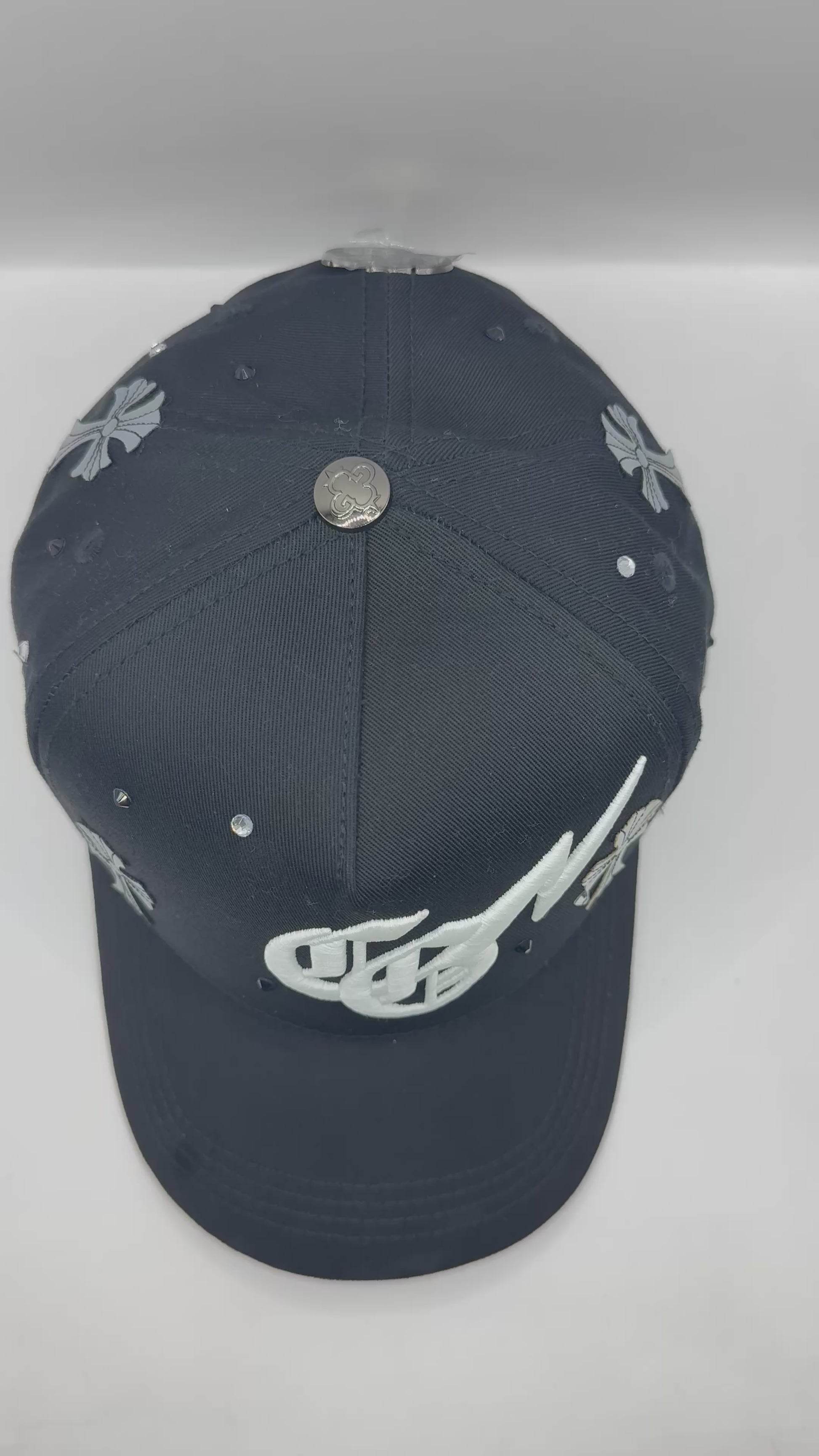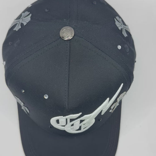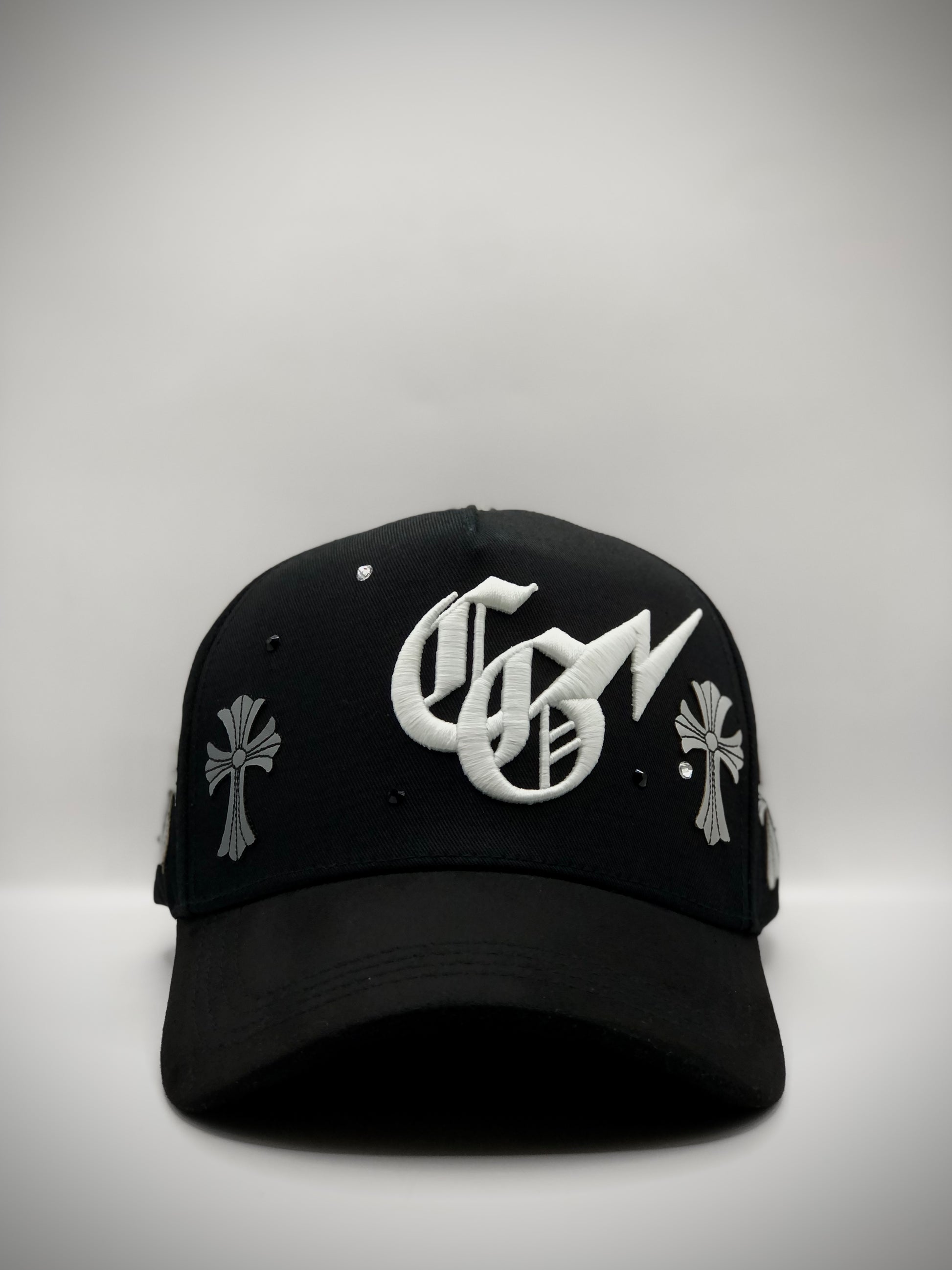 Gorra negra con una estética streetwear de culto. Presenta un logo frontal blanco con efecto glow in the dark que irradia estilo, complementado por cruces decorativas en los laterales. Una pieza exclusiva y audaz para quienes buscan un look distintivo que brille de día y de noche.